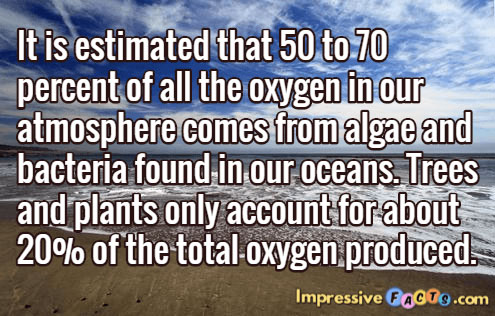 It is estimated that 50 to 70 percent of all the oxygen in our atmosphere comes from algae and bacteria found in our oceans. Trees and plants only account for about 20% of the total oxygen produced.